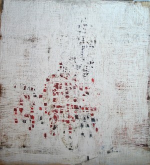 Up close, even those paintings most scraped down to the gesso become polychromatic cacophonies of accidental vectors formed by the scarping down; from afar the paintings evoke a sense of menace and looming imprisonment in the structures we ourselves have built.